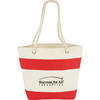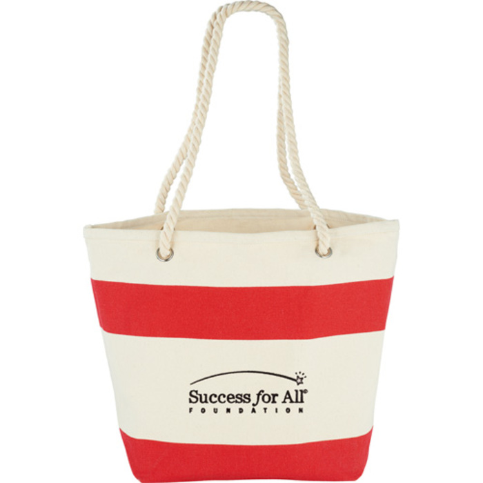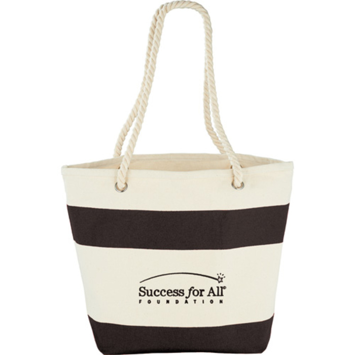 Show your stripes with this sturdy nautical tote. Open main compartment. 10" handle drop height. Soft cotton rope handles and graphic silk screen print make this tote stand out. Made from 100% natural cotton. Perfect alternative to plastic bags.